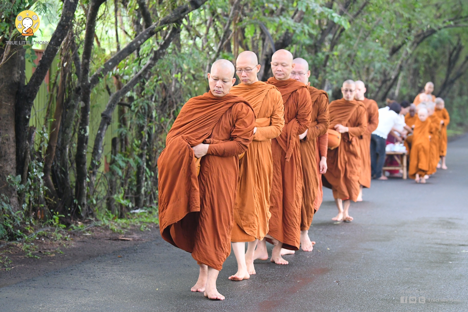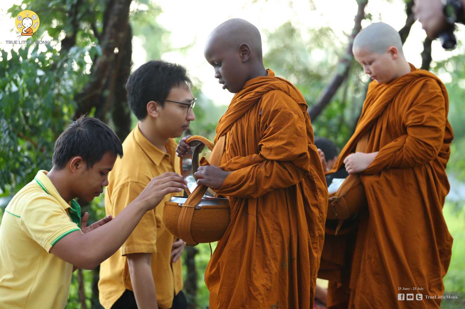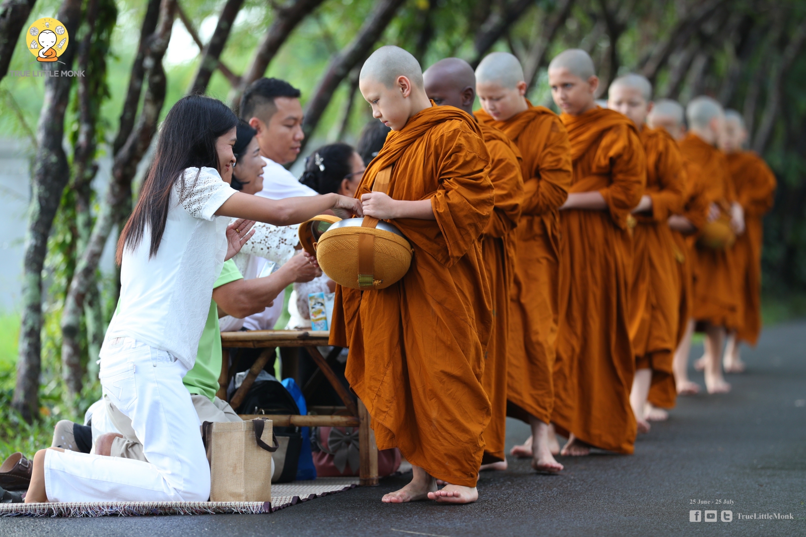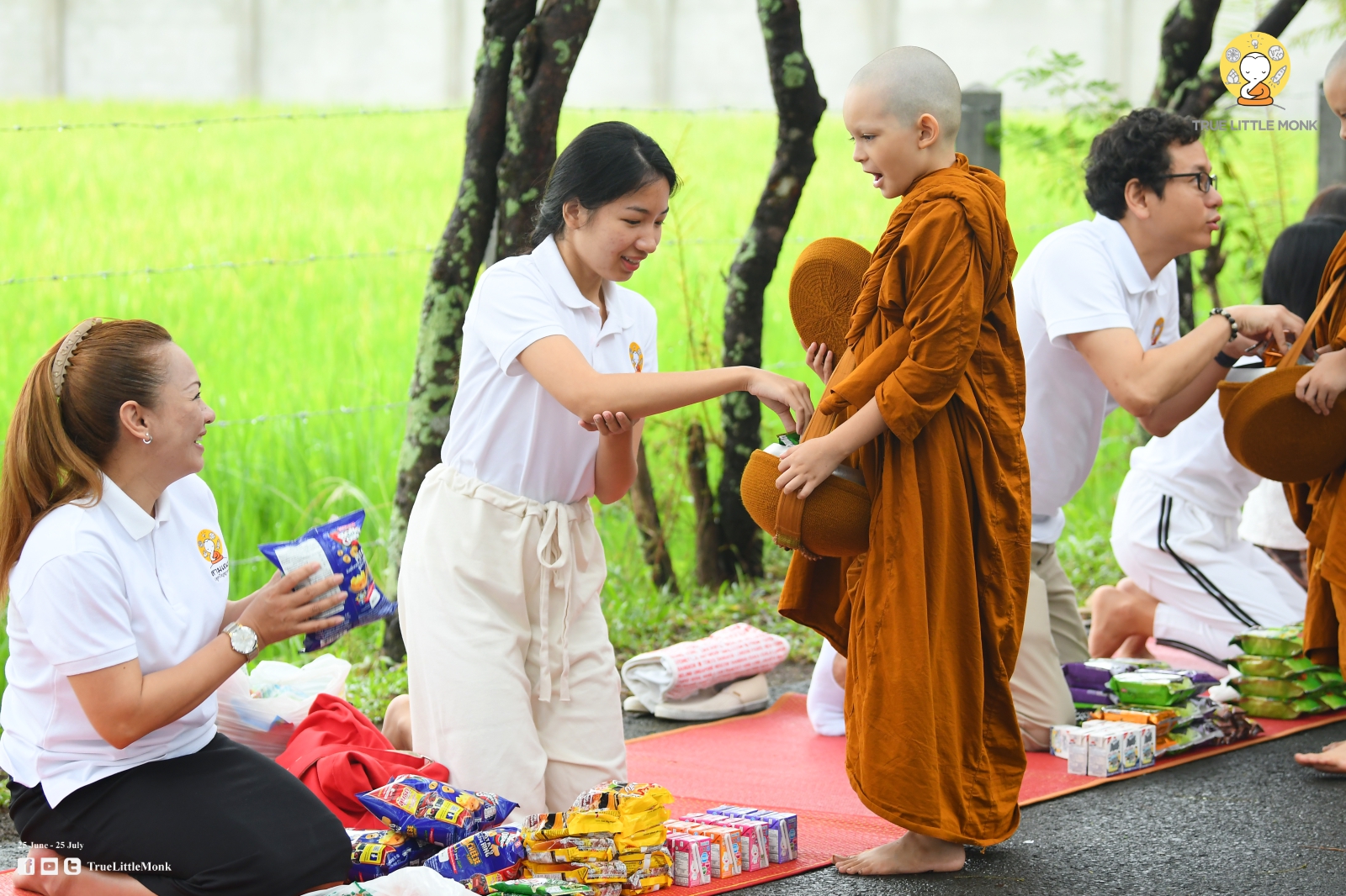 At dawn, the monastic mentors and the novices gathered for the morning chant, the daily routine of monastic life. After chanting, the monastic mentor and the novices went for alms in the community nearby and at the tree tunnels as usual. There were many people and novices' families waiting to give alms at the tree tunnel.