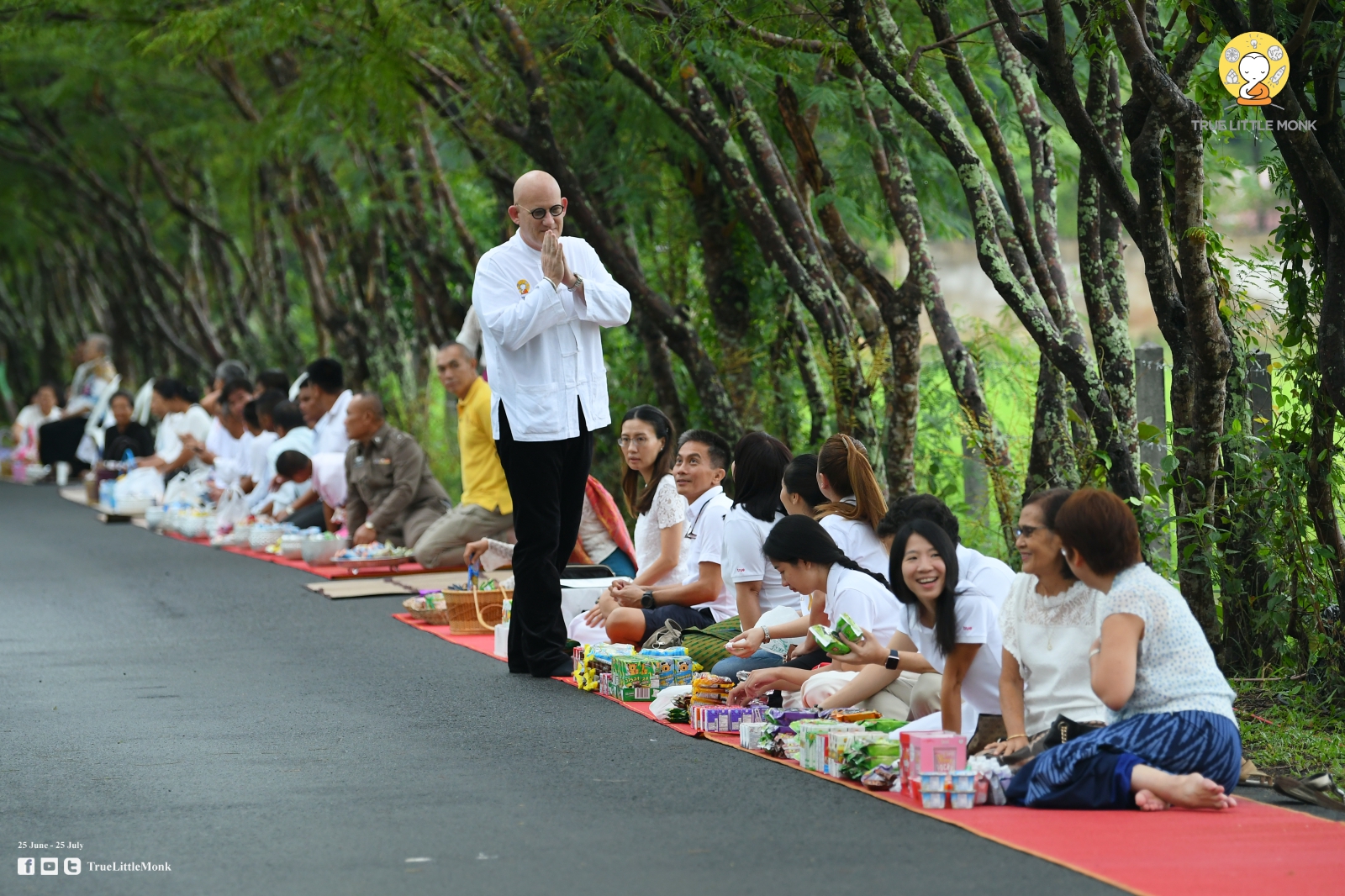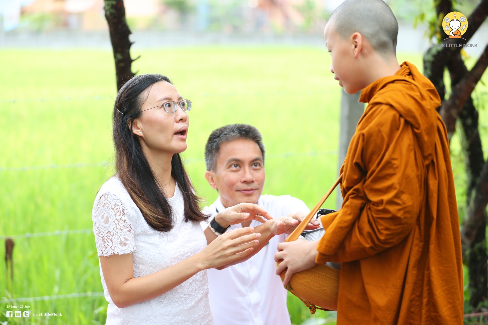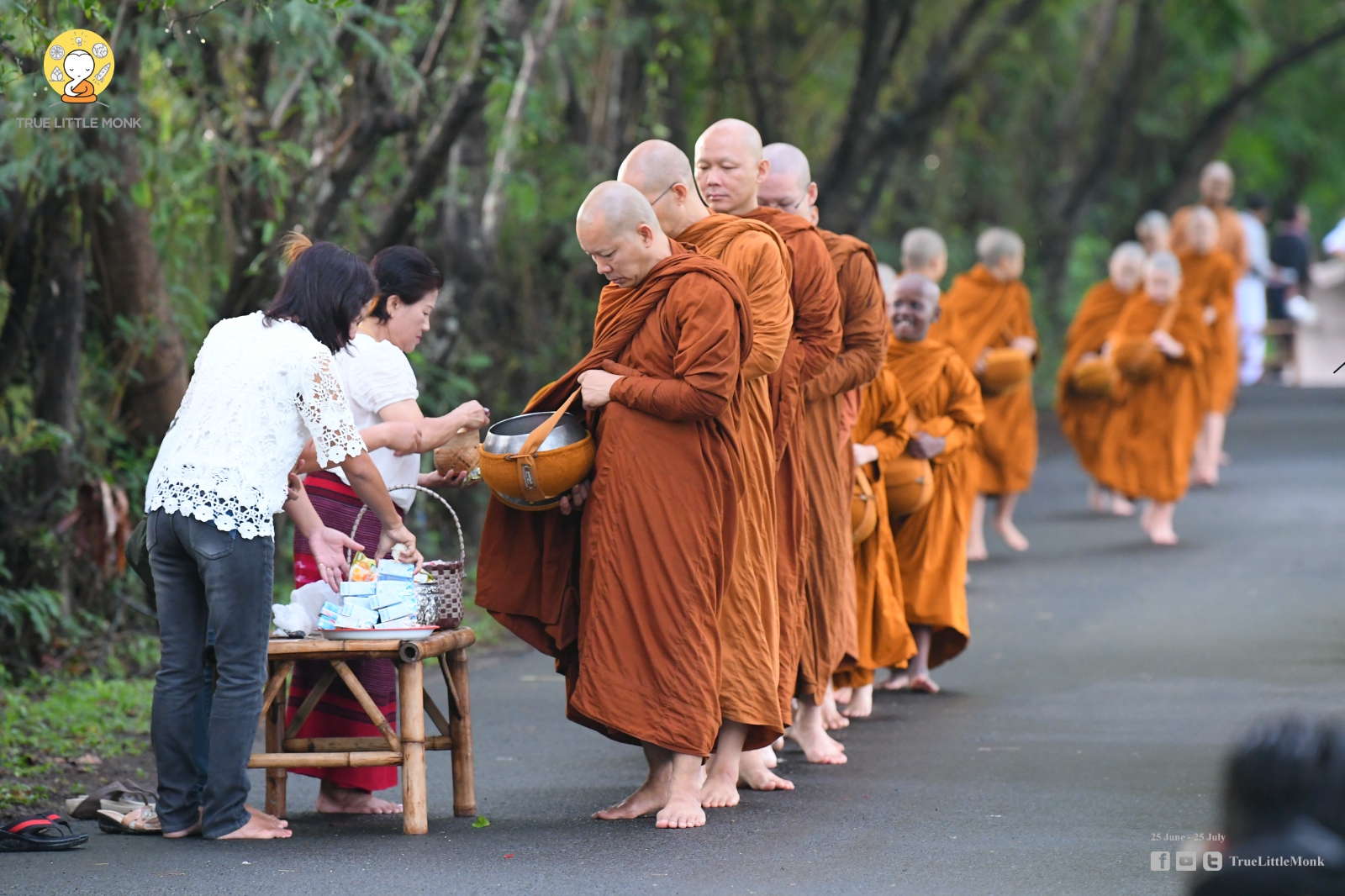 At dawn, the monastic mentors and the novices gathered for the morning chant, the daily routine of monastic life. After chanting, the monastic mentor and the novices went for alms in the community nearby and at the tree tunnels as usual. There were many people and novices' families waiting to give alms at the tree tunnel.