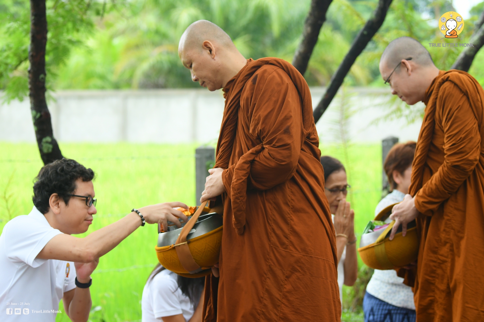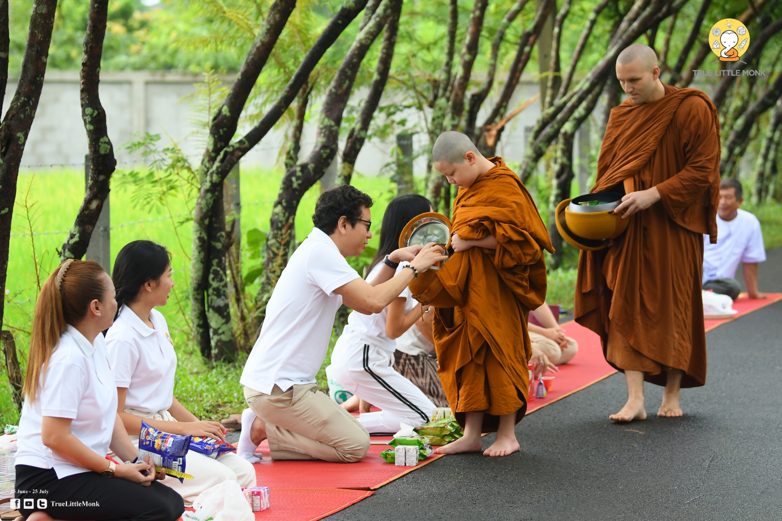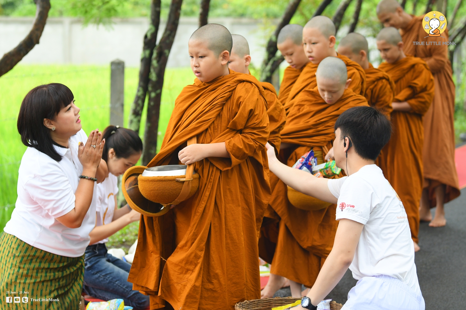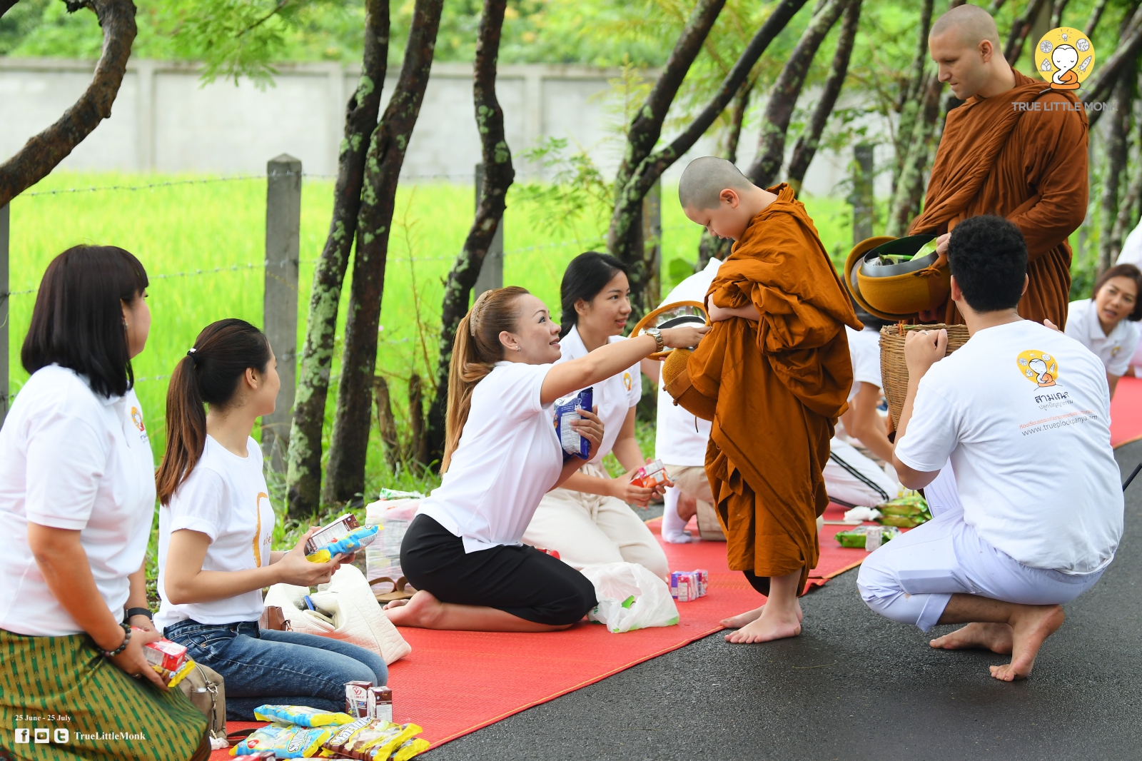 At dawn, the monastic mentors and the novices gathered for the morning chant, the daily routine of monastic life. After chanting, the monastic mentor and the novices went for alms in the community nearby and at the tree tunnels as usual. There were many people and novices' families waiting to give alms at the tree tunnel.